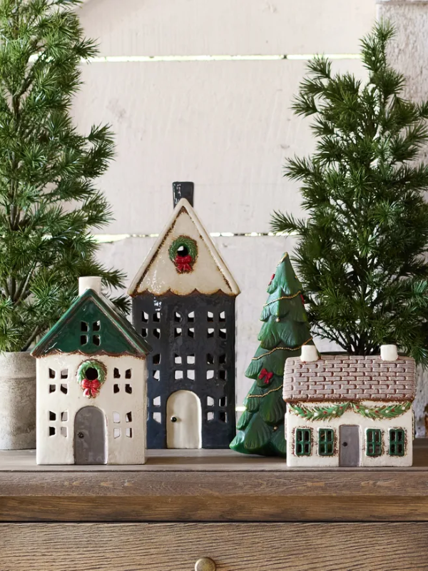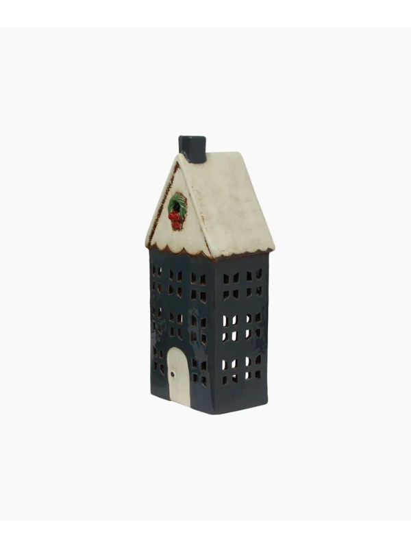Celebrate the holiday season with the Christmas Tea Light Blue House with Wreath Large. This hand-painted ceramic home, decorated with exquisite details, blends festive elegance with classic style. Ideal as a standalone decoration or as part of a curated collection for a radiant holiday display. Each cottage features a hidden compartment for a tea light, but please do not leave them unsupervised. Add a cozy touch to your home and holiday decor with these stunning cottages. They are a perfect addition to any Christmas setting.