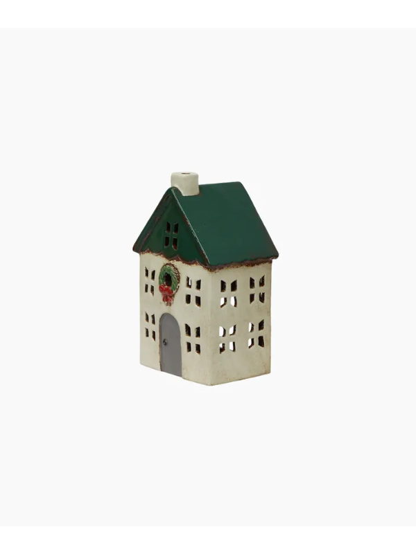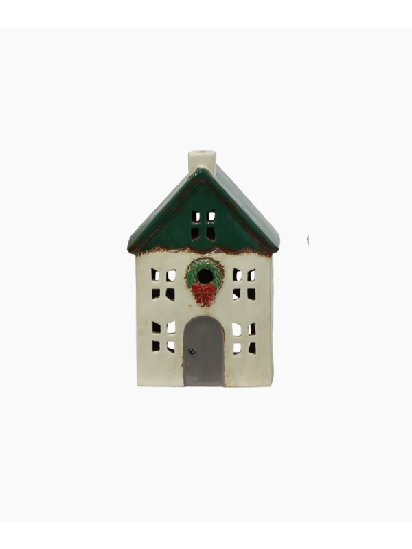 Celebrate the holiday season with the Christmas Tea Light Green House with Wreath Small. This hand-painted ceramic home, decorated with exquisite details, blends festive elegance with classic style. Ideal as a standalone decoration or as part of a curated collection for a radiant holiday display. Each cottage features a hidden compartment for a tea light, but please do not leave them unsupervised. Add a cozy touch to your home and holiday decor with these stunning cottages. They are a perfect addition to any Christmas setting.