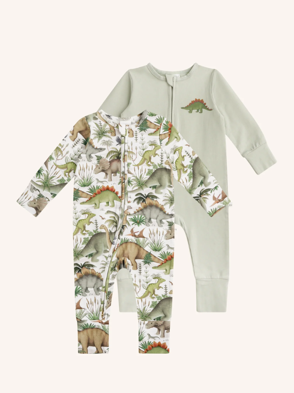 Two soft stretch cotton coveralls featuring charming dinosaur designs by Fleur Harris. Each piece includes a 2-way zip for effortless dressing and nappy changes, plus fold-over cuffs at hands and feet for added flexibility. Perfect for sleep or play, this beautifully boxed set combines comfort with timeless style—an ideal gift for new parents.