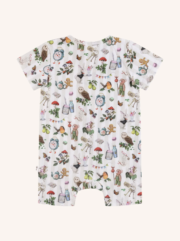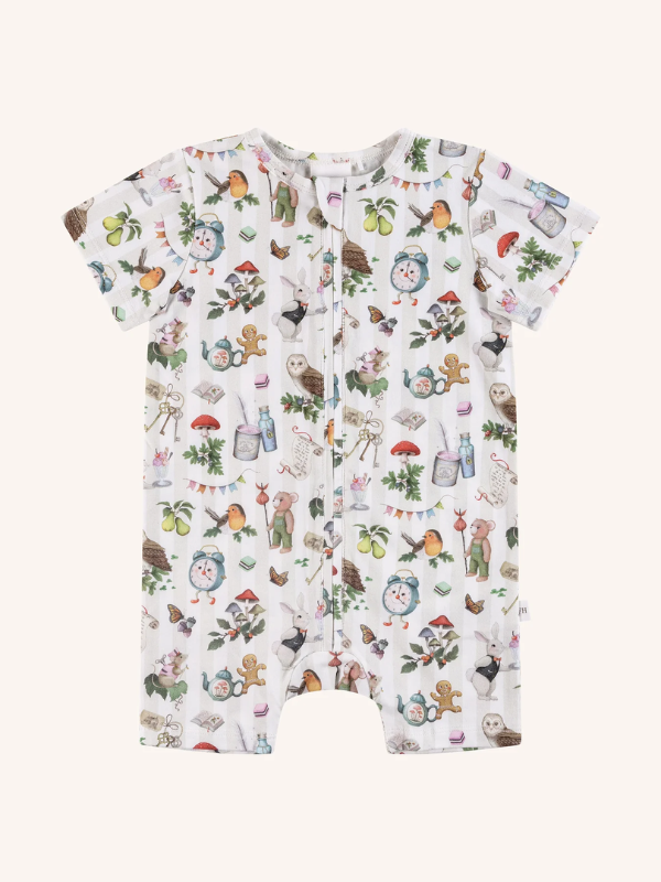 Introducing the Fleur Harris Timeless Shorty Coverall, inspired by Enid Blyton's beloved 'The Magic Faraway Tree'. This enchanting piece showcases Fleur's whimsical illustrations on a foundation of soft, breathable cotton that moves with your child. The thoughtfully designed front zip simplifies dressing and nappy changes, while the short sleeves offer ideal coverage for warmer weather. Perfect for both active exploration and restful moments, this versatile coverall combines practicality with imaginative charm, making it an essential addition to any young wardrobe.
