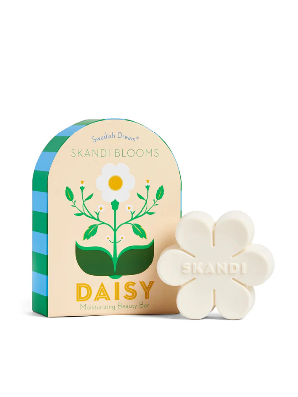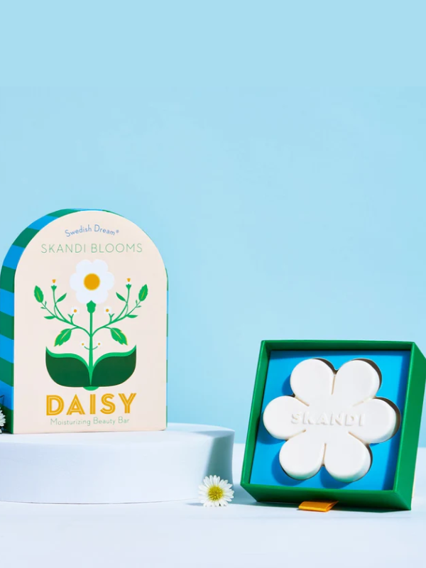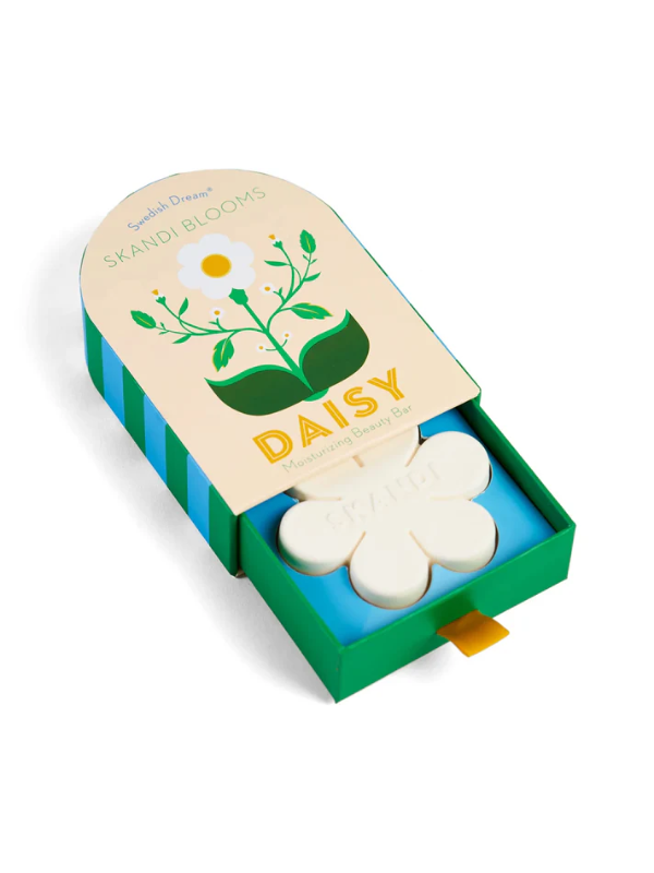 Embrace a touch of sunshine with Kalastyle’s Skandi Blooms Daisy Soap Bar. Infused with skin-softening sunflower lecithin, it leaves your skin feeling hydrated and refreshed. Daisies, symbols of joy and happiness, herald spring with their pristine white petals and vibrant yellow centers, evoking simplicity and renewal as winter fades. Delight in the fresh scent of spring rain gently misting a cluster of cheerful daisies. Elegantly packaged in a charming box with ribbon and a pull-out drawer, this soap makes a delightful and colorful gift. Crafted in the USA.