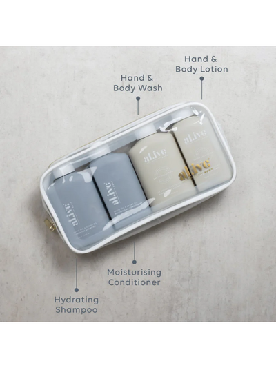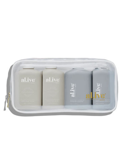 Experience the perfect combination of product purity and designer aesthetics with the al.ive Body Hair & Body Travel Pack. Indulge your senses and elevate your surroundings with these luxurious personal care products now conveniently available in travel sizes. Ideal for trips away from home. Encased in a stylish travel case, this set of 4 products adds a touch of elegance to your travels.