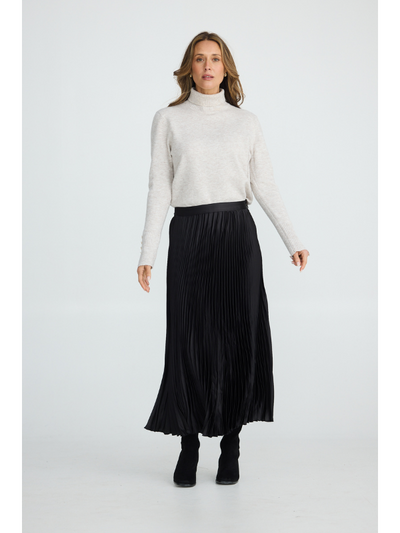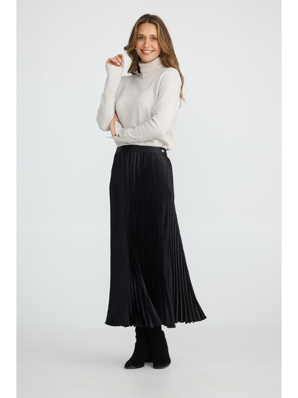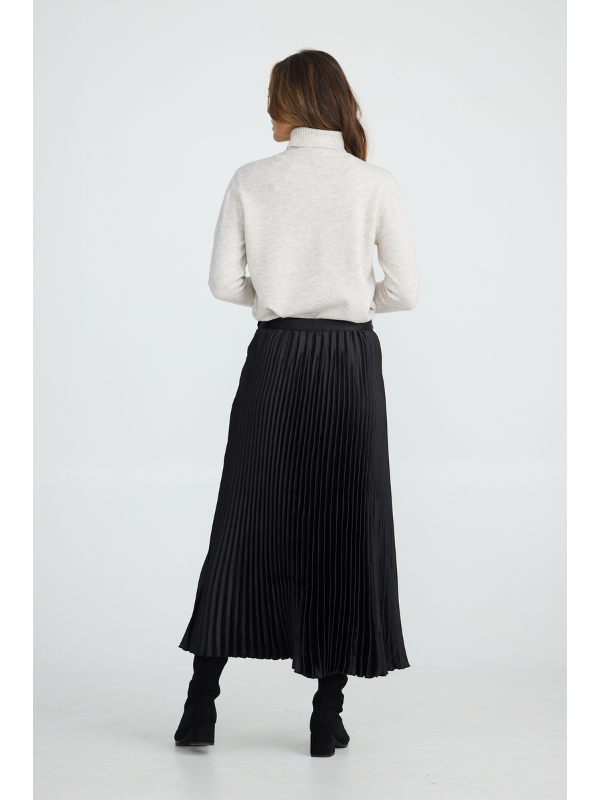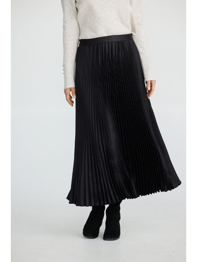 Indulge in the luxurious textures of our Brave + True Identity skirt in Black. Crafted from delicate pleated satin, this opulent piece boasts a side zip opening with a button closure for a flawless fit. The flowy, silky fabric adds a touch of elegance to this midi length skirt.