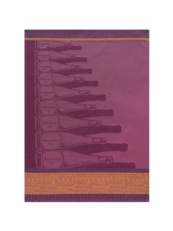The Wine Bottles Tea Towel showcases a playful design perfect for wine enthusiasts, featuring the lesser-known names of various French wine bottle sizes. Made from traditional cotton jacquard, it offers excellent absorbency with a touch of elegance.