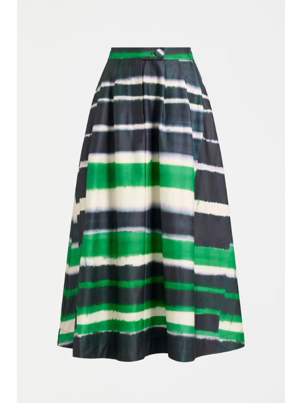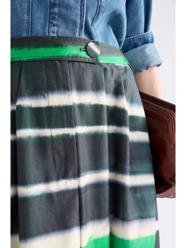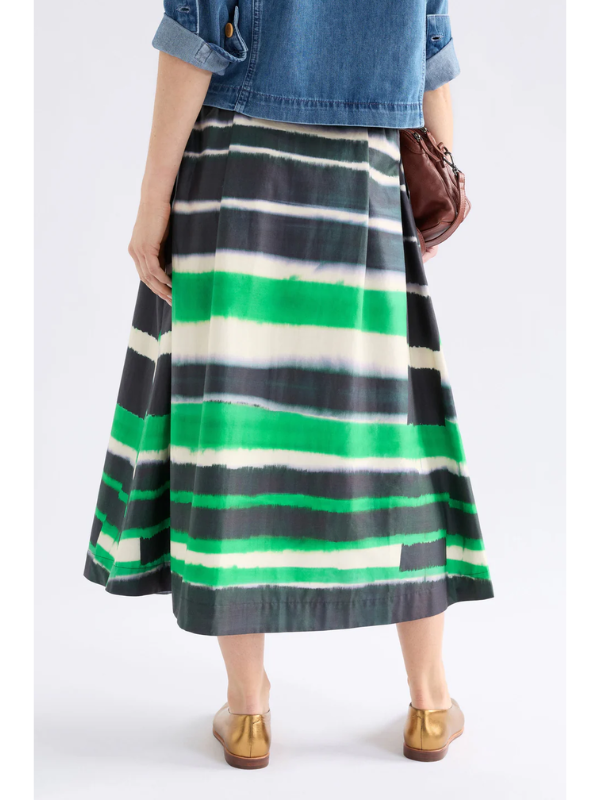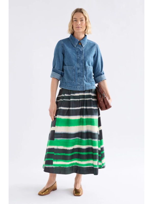 The Ida Skirt combines effortless style with sustainable comfort. This A-line midi features soft structured organic cotton in the eye-catching Saillte Print—a striking tie-dye effect in ink and verdant green against a cream base. The regular fit includes a flat front waistband with elastic side-back panels for all-day comfort, front and back pleats for movement, and angled front pockets for practicality. Secured with a zip fly and button closure, this versatile piece transitions seamlessly from casual daywear to dressed-up evenings. Style with simple tops, knitwear, or classic white shirting for a polished look.