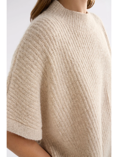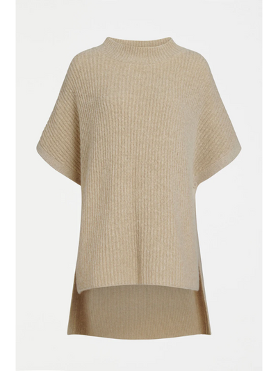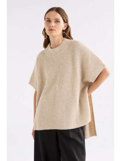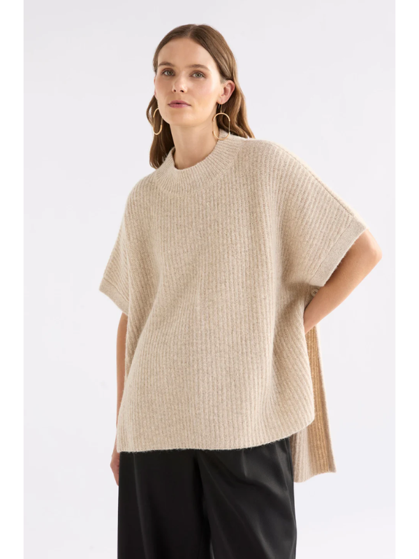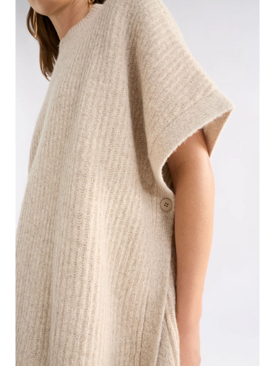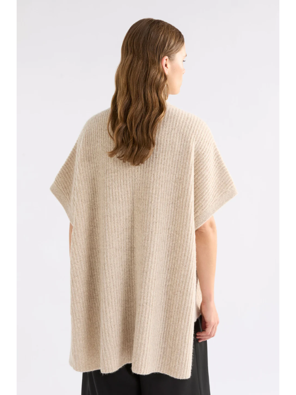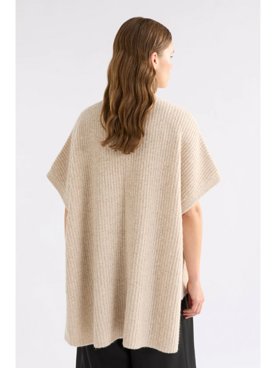 This timeless poncho is elevated with a refined blend of alpaca and merino wool, enhanced by a delicate lurex thread shimmer and reinforced with recycled nylon for lasting strength. Featuring a ribbed knit pattern and a funnel neck, it offers both texture and warmth. Side buttons create defined armholes, enabling a customizable fit. An elegant and cozy piece, perfect for sophisticated winter layering.
