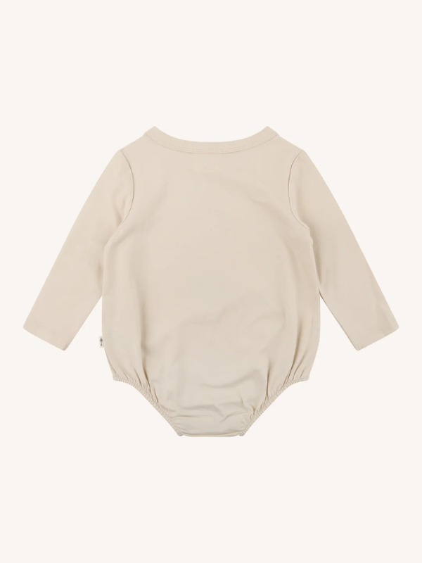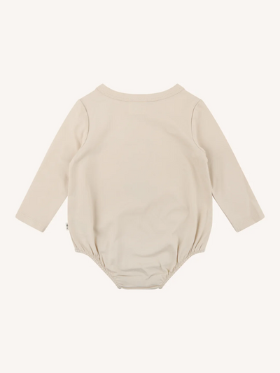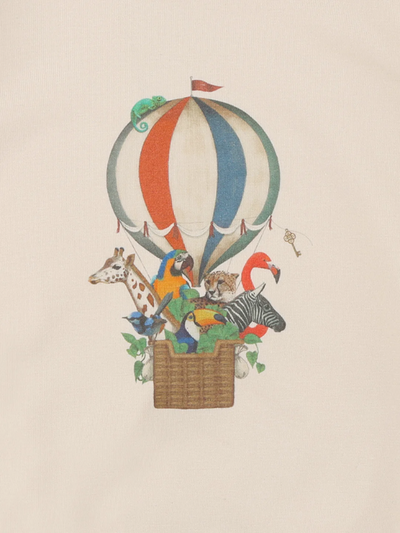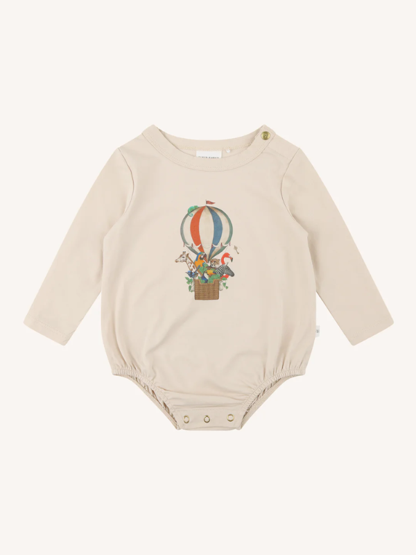 Indulge in the luxurious Fleur Harris Drifter Bodysuit from the exclusive 'Beautiful World' collection. Crafted with the finest cotton elastane jersey fabric, this piece showcases a charming balloon illustration. Perfect for exploring their world or dreaming in a whimsical atmosphere, this long sleeve bodysuit offers comfort and style for both sleep and play.