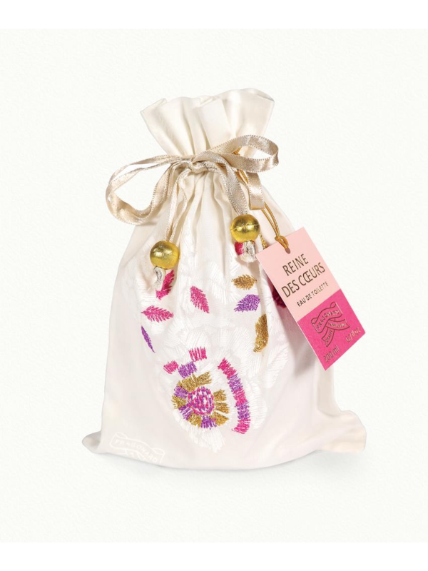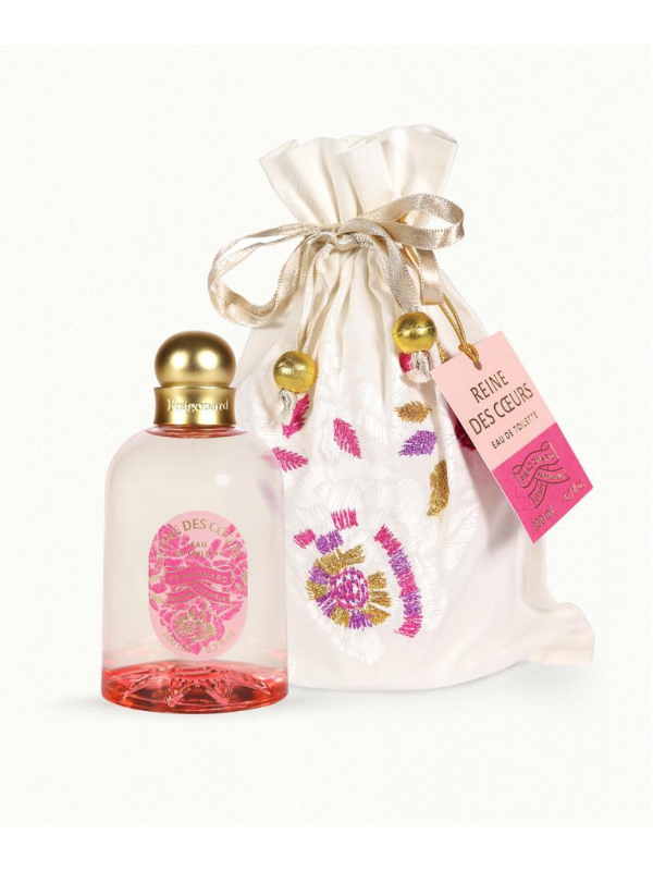 Fragonard Parfumeur's Reine des Coeurs Eau de Toilette entices, with it's fruity peach and spicy pink peppercorn head notes. Revealing heart notes of enchanting orange blossom, rose and ylang ylang against a backdrop of musk and benzoin, creating this captivating fruity oriental scent. Presented in a beautiful organdie keepsake bag.