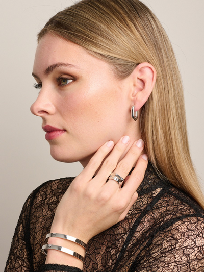 Indulge in the opulent beauty of Tiger Tree Gemma Hoop Earrings, crafted from luxuriously rhodium plated recycled brass with hypoallergenic posts. Experience the sophistication and exclusivity of this exquisite piece.