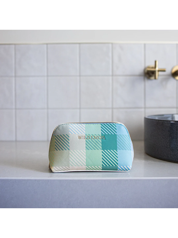 Crafted from opulent textured vegan leather, adorned with gold zippers, and featuring a bespoke printed lining, this petite blue check toiletry bag is ideal for organizing your travel necessities or doubling as a chic cosmetics pouch. Their compact size makes them perfect for a quick weekend retreat.