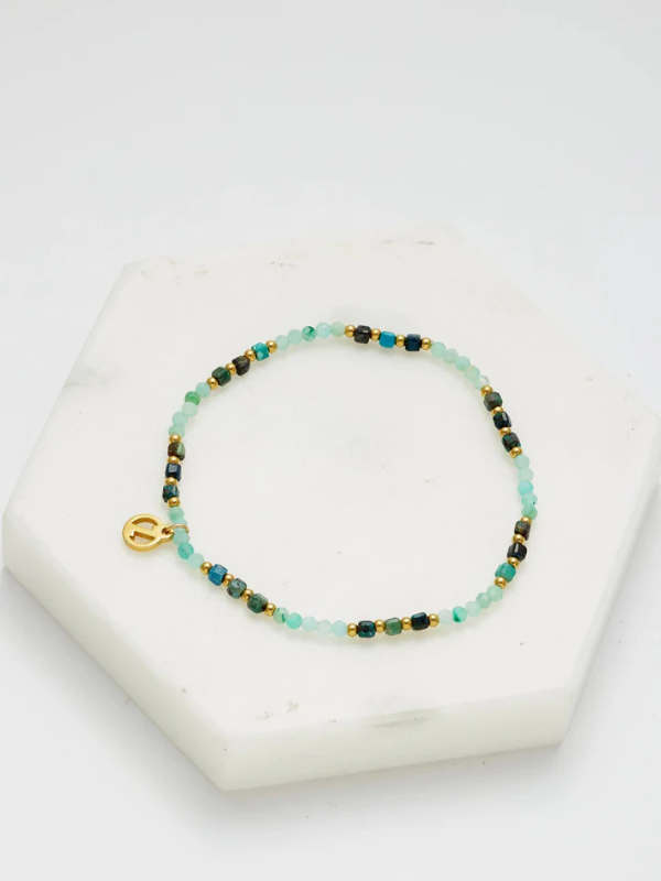 Effortlessly elevate any outfit with this sea and gold Zafino Hazel Bracelet. Meticulously crafted with semi-precious stone beads, it exudes timeless charm and sophistication. Perfect for everyday wear or special occasions.